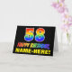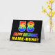 The front of this cheerful, fun, and colorful birthday greeting card design features a large number "58" and the message "HAPPY BIRTHDAY,", both having a rainbow spectrum gradient inspired pattern coloring, along with a bold yellow custom recipient name. The front also features a simple, minimal, black colored background. The inside has a customizable birthday greeting message, or could perhaps be cleared and left blank if a message is to be written by hand instead. A vibrant personalized birthday card like this might be a fun way of acknowledging somebody’s fifty eighth birthday. [~Z0000472]