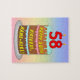 This cheerful and joyful birthday themed jigsaw puzzle design features a cartoon-style depiction of a three-tier birthday cake having numeral-shaped candles on top showing the number “58“, along with the message “HAPPY 58TH BIRTHDAY,”, and a custom recipient name. The background has a multicolored pastel rainbow spectrum inspired gradient pattern. A fun, editable birthday puzzle like this might be a fun way to deliver birthday greetings to somebody who is celebrating their fifty-eighth birthday. [~Z0000621]