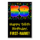 The front of this exciting, joyful, and vibrant birthday themed greeting card design features a large number “58” with a rainbow spectrum gradient inspired pattern, along with the message “Happy 58th Birthday,”, and a personalized recipient name. The front additionally features a multicolored background pattern of music notes and symbols having various sizes. The inside features a customizable birthday greeting message, or could perhaps be cleared and left blank if a message is to be written by hand instead. A customizable birthday card like this might be a fun way to send a message in celebration of somebody’s fifty eighth birthday. [~Z0000527]