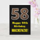 This rustic, fun birthday themed greeting card design features a large number "58" having a faux wood grain inspired style pattern on the front. The front also features the birthday greeting message "Happy 58th Birthday,", and an editable recipient name. The inside features a personalized birthday greeting message, or could perhaps be cleared and left blank if a message is to be written by hand instead. A customizable birthday card like this might be a fun way to acknowledge somebody’s fifty eighth birthday. [~Z0000433]