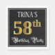 This elegant and fancy birthday paper napkin design features a personalized name and the message “58th Birthday Party”. The large number “58th” has an imitation/faux gold-inspired coloring pattern, and the words “Birthday Party” are in ornate script-style text. The background is colored black by default (although it can be customized). Ornate, opulent paper napkins like this might be useful to have at a birthday party/celebration being held to celebrate somebody’s 58th birthday. [~Z0000565]