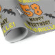 This scary and spooky Halloween birthday themed wrapping paper design features a large number "58". It also features the message "HAPPY BIRTHDAY,", plus an editable name. There are also depictions of a ghost and a bat on the front. Wrapping paper like this might be used when wrapping presents that are being given to somebody whose fifty eighth birthday falls on Halloween (October 31st). [~Z0000411]