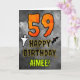 The front of this scary and spooky Hallowe’en themed birthday greeting card design features a large number “59”. It also features the message “HAPPY BIRTHDAY,”, plus a personalized name. There are also depictions of a ghost and a bat on the front. The inside features a personalized birthday greeting message, or could perhaps be cleared and left blank if a message is to be written by hand instead. A personalized birthday card like this might be a fun way to send a message in celebration of somebody’s fifty ninth birthday that also falls on Halloween (October 31st). [~Z0000547]