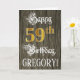 The front of this luxurious and formal birthday greeting card design features the message “Happy 59th Birthday,”, along with a personalized recipient name. Some of the message is in fancy script-style text, the large number “59th” features a faux/imitation gold-inspired look pattern, and the background has a faux/imitation woodgrain-inspired pattern. The inside has a custom birthday greeting message, or could perhaps be cleared and left blank if a message is to be written by hand instead. An elaborate, personalized birthday greeting card like this might be used to celebrate somebody’s fifty-ninth birthday. [~Z0000561]
