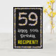The front of this floral, nature-inspired birthday greeting card design has the message “Happy 59th Birthday,” and a customizable recipient name. The large number “59” plus the border on the front both feature flower icons. The inside features a personalized birthday greeting message, or could perhaps be cleared and left blank if a message is to be written by hand instead. A fun, personalized, floral birthday greeting card like this might be sent in celebration of somebody’s fifty-ninth birthday. [~Z0000648]