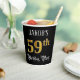 This elegant and fancy birthday themed paper cup design features a customizable name and the message “59th Birthday Party”. The large number “59th” has a faux/imitation gold-inspired coloring pattern, the words “Birthday Party” are in ornate script-style text, and the background is colored black by default (although it can be customized). Ornate, luxurious paper cups like this might be useful to have at a birthday party being held to honor somebody’s 59th birthday. [~Z0000567]
