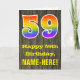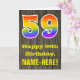 The front of this colorful yet rustic birthday greeting card design features a large number "59" with a rainbow spectrum gradient inspired pattern, along with the message "Happy 59th Birthday,", and an editable recipient name. The background of the front of the card features a rustic faux wood grain appearance pattern. The inside features a custom birthday greeting message, or could perhaps be cleared and left blank if a message is to be written by hand instead. A personalized birthday card like this might be a fun way to celebrate somebody’s fifty ninth birthday. [~Z0000419]