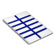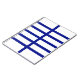 Inspired by a map symbol for railroad tracks, five blue stripes are split in half by a blue line down the center. The blue on white geometric pattern has a clean, sleek look.