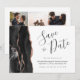 This elegant modern save the date card features a black watercolor agate border trimmed with faux rose gold glitter. The customizable text combines handwriting script, copperplate and italic fonts in charcoal gray on a white background. The reverse side provides spaces for 5 photos (2 square, 2 horizontal, 1 vertical) and a line for your website URL or other information. Easily replace the sample images with your own photos of the future bride and groom.