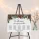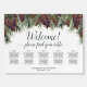 This beautiful wedding seating chart has space for 50 guests at 5 tables with 10 seats per table. It features a rustic yet elegant design with hand painted watercolor pine branches and pinecones in shades of forest green and chestnut brown. The title reads: Welcome! Please find your table written in fancy script calligraphy. There is space for the names of the couple and wedding date below. Wonderful way to welcome your guests to your wedding reception, while helping them to find their seats. Perfect for an outdoor, woodland, or mountain location.