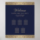 This wedding seating chart has 5 tables. The background is navy blue. It has floral golden borders with intricate wild roses decorations. The names of the bride and groom and the title Welcome are written in an elegant calligraphic script, the rest in caps. All text can be personalized and has a golden color similar to the gold roses on the borders.
