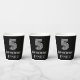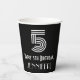 This Roaring Twenties inspired and vintage appearance birthday themed paper cup design features a large art deco inspired appearance number “5”, along with the birthday greeting message “Happy 5th Birthday,” and a personalized name. The background is colored black. Birthday themed paper cups like this might be used at a birthday party celebrating somebody’s fifth birthday. [~Z0000542]