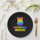 This cheerful, colorful, and fun birthday paper plate design features a large number "5" and the message "HAPPY BIRTHDAY,", both colored with a rainbow spectrum gradient inspired pattern, along with a bold yellow customizable name. It has a black colored background. Birthday themed paper plates like this might be used at a party celebrating somebody’s fifth birthday. [~Z0000488]