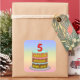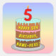 This colorful and cheerful birthday-themed square sticker design features a cartoon-style depiction of a three-tier birthday cake having a number-shaped candle on top showing the age “5“, along with the message “HAPPY 5TH BIRTHDAY,”, and a customizable recipient name. The background has a multi-color pastel rainbow spectrum inspired gradient pattern. Stickers like these might be given out or used at a birthday party held in celebration of somebody’s fifth birthday, or perhaps used when preparing gifts/presents or invitations for such an event. [~Z0000624]