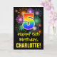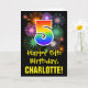 The front of this colorful, exciting, and fun birthday greeting card design features a large number "5" with a rainbow spectrum gradient inspired pattern, along with the message "Happy 5th Birthday,", and a custom recipient name. The front additionally has a colorful background pattern inspired by the look of bursting celebratory fireworks. The inside features an editable birthday greeting message, or could perhaps be cleared and left blank if a message is to be written by hand instead. A personalized birthday card like this might be a fun way to send a message celebrating somebody’s fifth birthday. [~Z0000442]