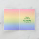 The front of this joyful and cheerful birthday greeting card design features the number “5“ having a vibrant rainbow spectrum inspired gradient pattern, along with the message “HAPPY 5th BIRTHDAY,” and a custom recipient name. Surrounding the rainbow-patterned number on the front are some photos that can be personalized, perhaps with photos of the recipient, the recipient’s family and friends, or the sender(s) of the card. There is also a multicolored rainbow spectrum inspired background gradient pattern behind the personalized message. The inside has a personalized birthday greeting message, or could perhaps be cleared and left blank if a message is to be written by hand instead. A cheerful, customized birthday greeting card like this might be used to acknowledge somebody’s fifth birthday. (Photography © Storytree Studios, Stanford, CA.) [~Z0000662]
