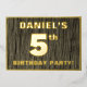 The front of this bold fifth birthday party foil invitation card features an editable name, a large number “5th”, the message “BIRTHDAY PARTY!”, and a border, all in foil. There is a rustic, yet elegant, faux wood grain appearance inspired pattern for the background of the front. The back features personalized details about the event, such as the date, time, location/venue, and any other useful information. Customized invitations like these might be used to invite guests to a birthday gathering/party being held to honor somebody’s 5th birthday. [~Z0000598]