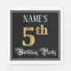 This elegant and ornate birthday paper napkin design features a personalized name and the message “5th Birthday Party”. The large number “5th” has a faux/imitation gold-inspired coloring pattern, the words “Birthday Party” are in luxurious script-style text, and the background is colored black by default (although it can be customized). Luxurious, fancy paper napkins like this might be useful to have at a birthday party being held to celebrate somebody’s 5th birthday. [~Z0000565]