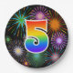 This colorful, fun, and cheerful paper plate design features a large number "5" containing a rainbow spectrum gradient inspired pattern. It also features a exciting and vibrant bursting celebratory fireworks inspired pattern. It has a black colored background. Fun paper plates like this might be used at a celebration being held in honor of somebody’s fifth birthday, a 5th anniversary, or some other 5th event. [~Z0000490]
