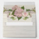 5x7 A2 Custom designed two-sided preprinted return address envelopes to match the wedding invitation, bridal shower party and rehearsal dinner invitations in this set. PLEASE NOTE: THESE TAKE 3-4 WEEKS TO HAND MAKE SO ALLOW ENOUGH TIME TO RECEIVE THE ENVELOPES BEFORE SENDING OUT INVITATIONS. The background is a faded, worn, distressed barn wood fence background with a floral border both inside the envelope and on the back flap. There are pink and creamy white roses, rose buds and pink hydrangeas with mint green succulent leaf foliage for a modern, pretty and classy style. Hand painted by Audrey Jeanne Roberts, copyright, all rights reserved.