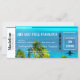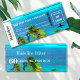 A beautiful ocean blue and Palm trees image is the background for this Boarding Pass Destination theme invitation.