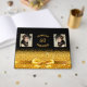 Elegant, classic, glamorous and feminine. A faux gold colored ribbon with a bow with golden glitter and sparkle, a bit of bling and luxury. A guestbook for a 60th birthday party. Black background. With the text on the front cover: 60 and Fabulous! Templates for two of your own photos.