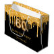 A chic black background. Decorated with faux gold glitter drips, paint dripping look. Personalize and add a name. With the text: Happy Birthday. The name is written with a mode hand lettered style script. Number 60 is written with a balloon style font.