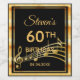 A wine or sparkling wine bottle label for an elegant black and gold themed 60th birthday party. Templates for a name, age, and date of the party. Golden colored letters. Black background color and a faux gold frame and golden music notes. You can change the background color to match your theme. Click customize and then "select a background color" on your right.