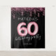 Girly 60th birthday party photo booth backdrop featuring a trendy black background, pink glitter and confetti, 60 pink hellium balloons, the birthday girls name, and date.