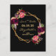 On front: Trendy bohemian boho style. Decorated with watercolored roses in burgundy and pink. Elegant black background. A faux gold geometric frame and templates for a name, date and age. Burgundy colored letters. The name and the text: Save the Date are written with a modern hand lettered style script.