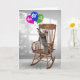 Playful tabby cat standing on a wooden rocking chair and reaching for a colorful balloon bouquet for 60th birthday.