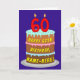 The front of this joyful and fun birthday themed greeting card design features a depiction of a three-tier birthday cake having numeral-shaped candles on top showing the number “60“, along with the message “HAPPY 60TH BIRTHDAY,”, and an editable recipient name. The inside has a customized birthday greeting message, or could perhaps be cleared and left blank if a message is to be written by hand instead. A cheerful, customized birthday greeting card like this might be sent in celebration of somebody’s sixtieth birthday. [~Z0000620]