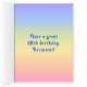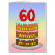 This joyful and upbeat birthday greeting card design features a cartoon-style depiction of a three-tier birthday cake having numeral-shaped candles on top showing the number “60“, along with the message “HAPPY 60TH BIRTHDAY,”, and a customizable recipient name. The background of the front features a multicolored pastel rainbow spectrum inspired gradient pattern. The inside features a customizable birthday greeting message, or could perhaps be cleared and left blank if a message is to be written by hand instead. A cheerful, customized birthday greeting card like this might be used to acknowledge somebody’s sixtieth birthday. [~Z0000626]