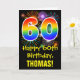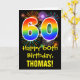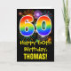 The front of this exciting, fun, and colorful birthday-themed greeting card design features a large number "60" having a rainbow spectrum gradient inspired pattern. It also features the message "Happy 60th Birthday,", and a personalized recipient name. The front additionally has a colorful background pattern inspired by the appearance of bursting celebratory fireworks. The inside features a customizable birthday greeting message, or could perhaps be cleared and left blank if a message is to be written by hand instead. A customizable birthday card like this might be a fun way to celebrate somebody’s sixtieth birthday. [~Z0000442]