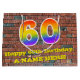 This colorful and vibrant birthday-themed gift bag design, inspired by graffiti, features a large number "60" having a rainbow spectrum gradient inspired pattern. It also features the message "Happy 60th Birthday,", and an editable name. It also has a brick wall style pattern background. A birthday themed gift bag like this might be a fun way to wrap a gift or present being given to celebrate somebody’s sixtieth birthday. [~Z0000522]