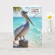 A pelican wearing sunglasses stands confidently on a wooden dock piling by the sea for a 60th birthday.