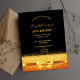 A modern, stylish and glamorous invitation for a woman's 60th birthday party. A chic black background with an elegant faux gold bow, ribbon and sparkle. The name is written with a modern golden hand lettered style script. Templates for your party details.