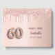 A guestbook for a girly and glamorous 60th birthday party. A faux rose gold background with rose gold faux glitter drips, paint dripping look. Personalize and add a name and date. The name is written in dark rose gold with a modern hand lettered style script. Number 60 is written with a balloon style font.