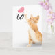 Gold tabby cat with pink heart balloon for 60th birthday on white background.