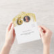 A white background, decorated with faux gold confetti on the inside. Personalize and add a photo, name, party details, RSVP date, return address and name.