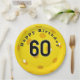 Close-up of a neon yellow pickleball for a 60th birthday.