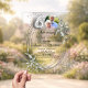 A clear, transparent background. Decorated with greenery, an oval frame and faux diamonds. Personalize and add a photo, names and details.