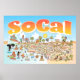 Bright and colorful scene offers a spectacular view of Southern California - wacky characters frolic on the beach and desert of SoCal showcasing Los Angeles, Long Beach, San Diego, Santa Barbara, Riverside, Palm Springs, Anaheim, Anza Borrego and Joshua Tree parks as well as the border cities of Tijuana, Tecate and Mexicali. This charming scene has it all – a surfer hangs ten while a mermaid lounges on a rock, a killer whale leaps out of the water, zoo animals greet the tourists, a muscular beach couple both flex to impress as a T-Rex roars a challenge and a tank moves into position and much more…