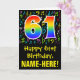 The front of this fun, colorful, and vibrant birthday themed greeting card design features a large number "61" having a rainbow spectrum gradient inspired pattern. It also features the message "Happy 61st Birthday,", and a customizable recipient name. The front also has a colorful music notes and symbols pattern. The inside features a custom birthday greeting message, or could perhaps be cleared and left blank if a message is to be written by hand instead. A personalized birthday card like this might be a fun way to celebrate somebody’s sixty first birthday. [~Z0000420]