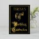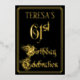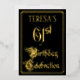 The front of this fancy and opulent foil sixty-first birthday celebration/party invitation design features the message “61st Birthday Celebration” in elegant script-style text. It also has an editable name. The background of the front is colored black by default (although it can be customized to a different color). The back features personalized details about the event, such as the date, time, location, and any other information that may be relevant. Ornate, elegant, editable invitations like these might be used to invite guests to a birthday celebration being held to honor somebody’s 61st birthday. [~Z0000589]