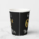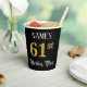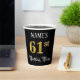 This elegant and luxurious birthday-themed paper cup design features a customizable name and the message “61st Birthday Party”. The large number “61st” has a faux/imitation gold-inspired coloring pattern, the words “Birthday Party” are in ornate script-style text, and the background is colored black by default (although it can be customized). Fancy, opulent paper cups like this might be useful to have at a birthday party being held in celebration of somebody’s sixty first birthday. [~Z0000567]