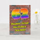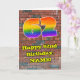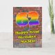 This exciting and fun urban graffiti and street art themed birthday greeting card design features a large number “62” with a multicolored rainbow spectrum gradient inspired pattern, along with the message “Happy 62nd Birthday,”, and a personalized name. The background of the front has a brick wall pattern. The inside features a customized birthday greeting message, or could perhaps be cleared and left blank if a message is to be written by hand instead. A colorful, personalized birthday greeting card like this might be sent in celebration of somebody’s sixty-second birthday. [~Z0000586]