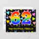 The front of this loving, exciting, and colorful birthday postcard design features a large number "62" with a rainbow spectrum gradient inspired pattern, along with the message "Happy 62nd Birthday,", and an editable recipient name. The front additionally features a vibrant and colorful background pattern featuring loving heart shapes of different sizes. The back features a customizable birthday greeting message, or could perhaps be cleared and left blank if a message is to be written by hand instead. A birthday postcard like this might be a fun way to send birthday wishes to somebody who is celebrating their sixty second birthday. Postcards like this might also be used to invite guests to a birthday celebration being held for somebody who is turning 62 years old. [~Z0000448]