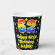 This fun and cheerful birthday themed paper cup design features a large number “62” with a rainbow spectrum gradient inspired pattern, along with the message “Happy 62nd Birthday,”, and a personalized name. The background features a multicolored star field inspired pattern. Vibrant, colorful paper cups like this might be fun to use at a birthday party/celebration being held to honor somebody’s sixty second birthday. [~Z0000540]