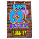 The front of this fun birthday themed gift bag design features the message “HAPPY 62ND BIRTHDAY,” having a colorful, vibrant, graffiti-inspired appearance, in addition to a custom recipient name. The background features a pattern inspired by the look of a brick wall. A gift bag like this might be used when wrapping gifts being given to somebody in celebration of their 62nd birthday. [~Z0000536]